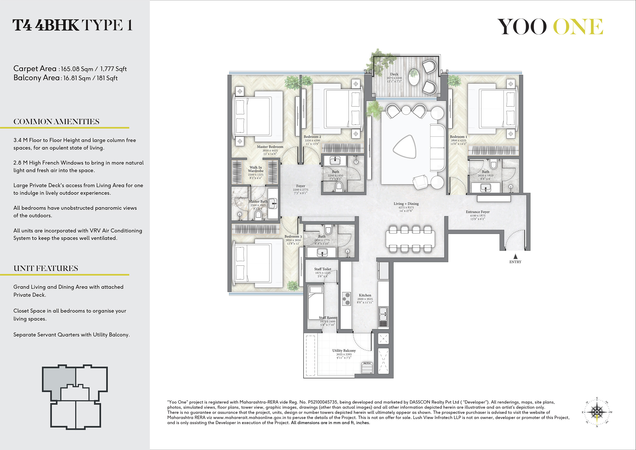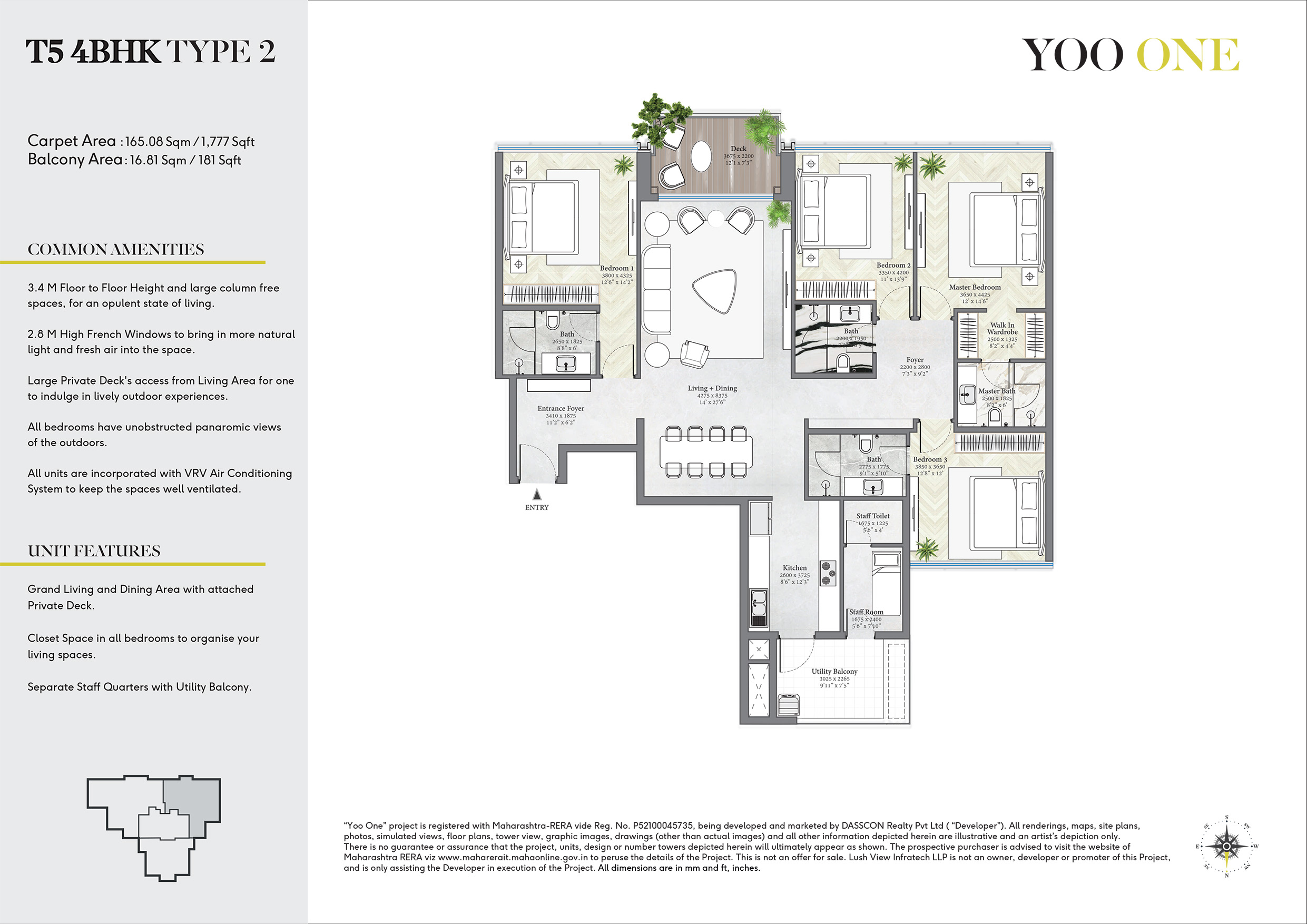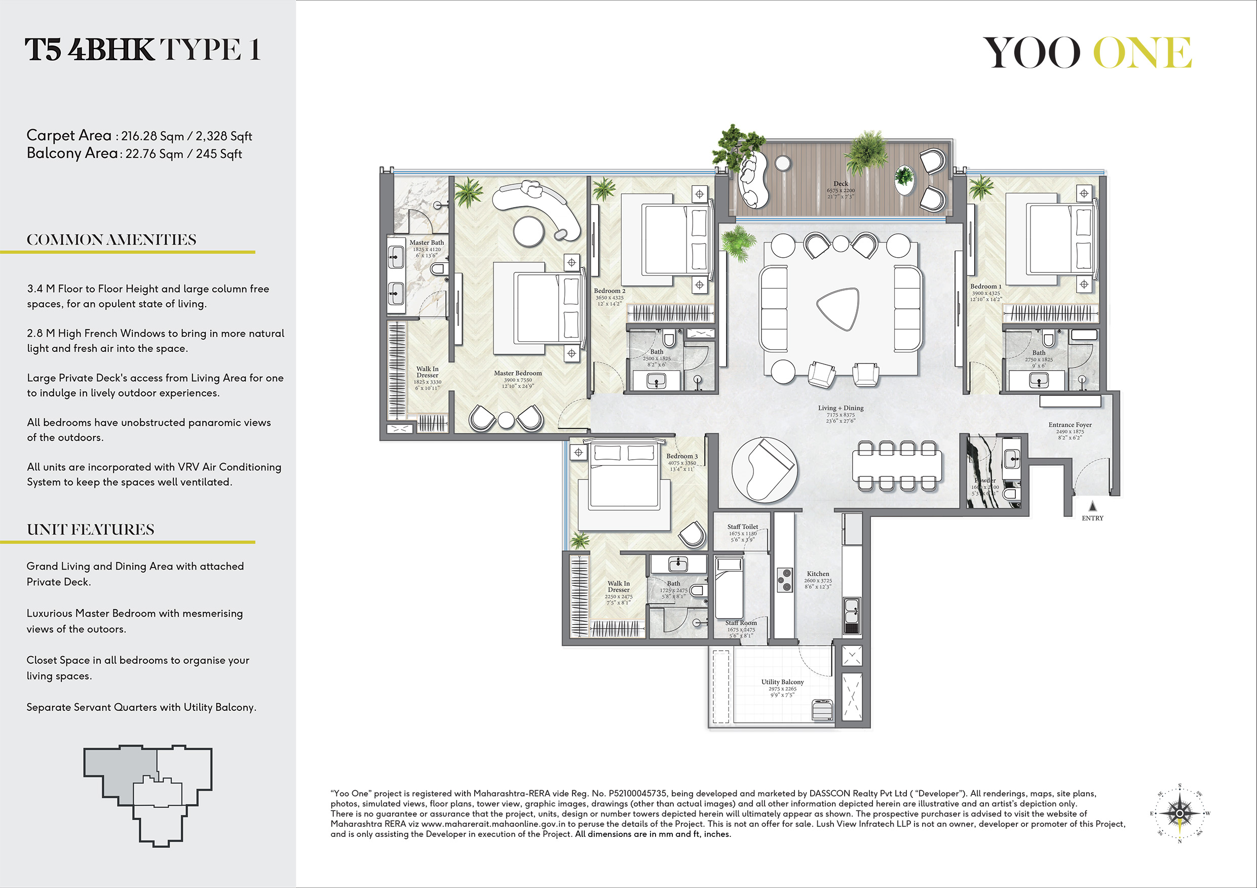 "Yoo One” project is registered with Maharashtra-RERA vide Reg. No. P52100045735, being developed and marketed by DASSCON Realty Pvt Ltd ( “Developer”). All renderings, maps, site plans, photos, simulated views, floor plans, tower view, graphic images, drawings (other than actual images) and all other information depicted herein are illustrative and an artist’s depiction only. The project, units, design or number of towers depicted herein are subject to change as maybe decided by the company or directed by any competent authority in the best interest of the development.